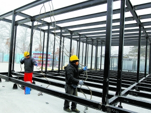 昨天,工人們?cè)谇迦A大學(xué)內(nèi)搭建“零耗能”住宅。從現(xiàn)在起至4月份,20名教授和50名學(xué)生將在清華游泳館東側(cè)的空地上搭建一所“零耗能”住宅,這是清華大學(xué)參加國(guó)際太陽(yáng)能十項(xiàng)全能競(jìng)賽的作品。目前,房子的整體鋼結(jié)構(gòu)已經(jīng)搭建完畢。本報(bào)記者吳鏑攝